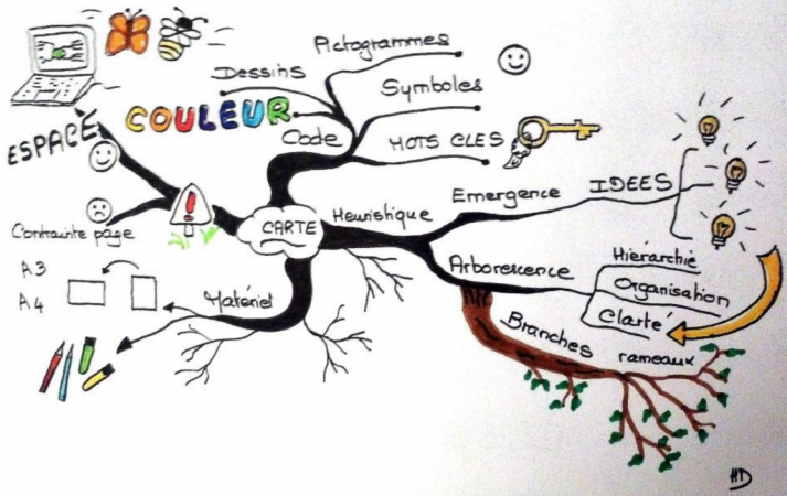 Le « mind mapping » est une manière de présenter ses idées sous une forme synthétique, à l’aide de mots clés, de dessins et de couleurs.