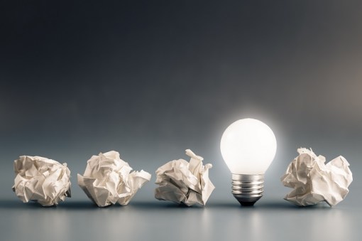 Small light bulb glowing in a row of crumpled paper balls, inspiration, problem and solution concept